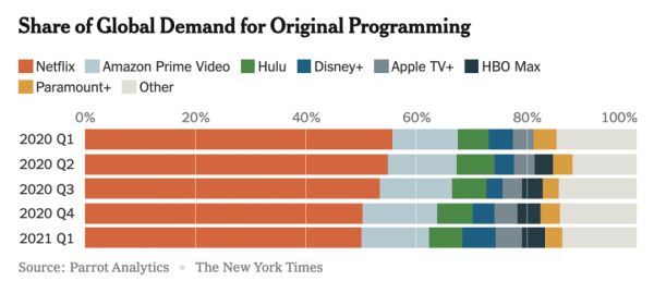 创始人的信心是一方面,但巨头们对 Netflix 的蚕食也是实实在在。2020 年,Netflix 原创节目的市场份额从年初的 56% 跌至了 50%。