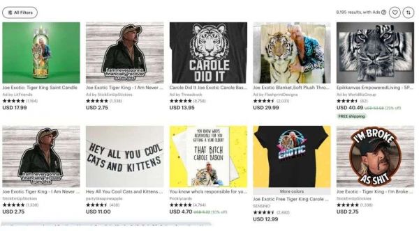 去年 Netflix 自制纪录片《虎王》上线 10 天就有 3430 万人观看,是 Netflix 最成功的剧集。在电商品牌 Esty 上立刻出现了大量《虎王》周边。但无一列外,它们都是山寨的。