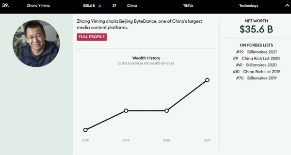 2021年4月,《福布斯》发布“2021福布斯全球富豪榜”,张一鸣以356亿美元身家,排名第39位。