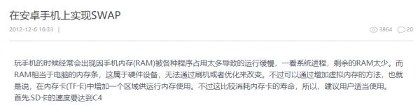 到了移动时代,扎根于Linux的安卓系统同样支持虚拟内存功能。早在安卓2.2时期,谷歌就已经允许用户通过swapper2这类软件自行划分SWAP分区。考虑到当时安卓手机RAM规格普遍偏小,确实有不少玩家购买高速SD卡结合这项技术提高后台能力的。