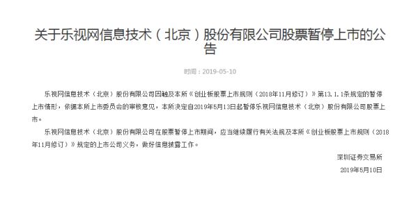 深交所在公告中表示,乐视网因触及《创业板股票上市规则(2018年11月修订)》第13.1.1条规定的暂停上市情形,决定自2019年5月13日起暂停乐视网信息技术(北京)股份有限公司股票上市。