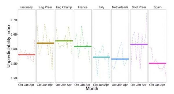 统计学家甚至对足球的不可预测性进行了定量分析——也就是“强”队到底有多大把握打败“弱”队。结果发现,英超15-16赛季确实是过去13个赛季里最不可预测的,但是,和这13个赛季之间并没有统计显著的差异……