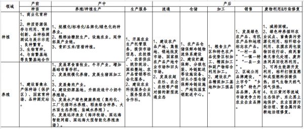 指引中提出13个投资领域,按照农业生产(产前-产中-产后)、农业上下游、农村发展三个板块进行重新归类。简述如下: