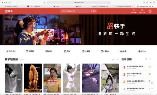 从截图就可以看出,此次pc版的视频大多是超过1分钟的中视频,且很多都是横版视频,由此不难看出,网页版在视频推荐上,主要场景就是为了满足用户对于中长视频的需求,毕竟在电脑端观看横版的体验更加。不同于快手网页版,快手的网页版上很多还是竖屏的短视频,观看体验上也和移动端的体验相似,不过快手在分类上并不是按照视频标签区分类,而是按照短视频、直播、长视频、小剧场、电影等类型去划分,和抖音的分类还是有较大区别。