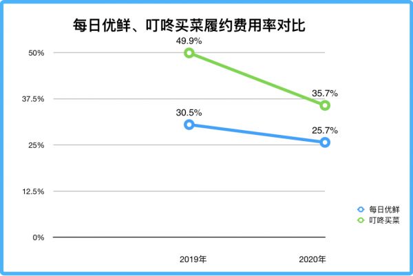 对比叮咚买菜与每日优鲜的履约费用率会发现,虽然前置仓运营效率已有提升,叮咚买菜的履约费用率从2019年的49.9%降到了2020年的35.7%,仍然高出每日优鲜(2020年履约费用率为25.7%)近10个百分点。