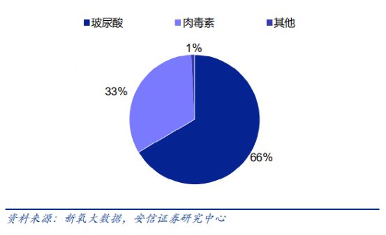 现阶段,中国医美市场主要被玻尿酸和肉毒素两系列产品所占据。据安信证券数据,截至2018年度,肉毒素的市场份额约为玻尿酸的一半。