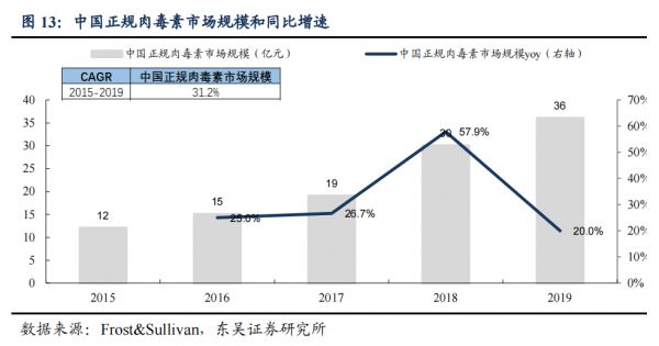 纵观整个行业,仍将保持稳定增长的势头。据Frost的预测,过去四年肉毒素市场的增速超过31%,至2019年正规肉毒素市场已经超过36亿元。市场预计,未来五年这一赛道仍将保持17.5%的高复合增长率。