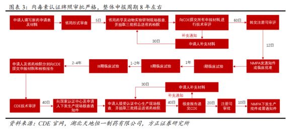 正如前文所述,肉毒素具有高毒性,稍有闪失就会造成很可怕的后果,因此中国对于肉毒素产品审批极为繁琐,周期往往在8年以上。