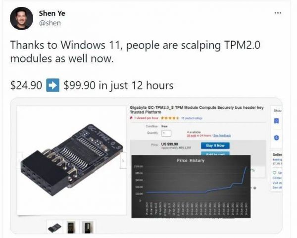 Windows 11 系统对于 TPM 芯片的强制要求一时间激发了人们对于这一芯片的需求,这也导致多个平台 TPM 芯片价格上涨,Twitter 上就有用户发文表示 12 小时内芯片价格涨了好几倍,从 24.9 美元涨到了 99 美元。
