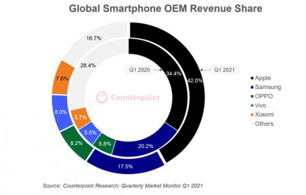 5月初时,华为消费者业务CEO余承东发了条朋友圈,转发了一条《跌倒华为,吃饱苹果》的文章,并评论称:华为手机平板的国内市场让给了苹果,中档及低端让给了OPPO、vivo和小米等,海外让给了苹果三星及国内同行。