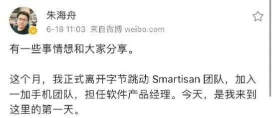 6月16日,一加CEO刘作虎在内部邮件中宣布:一加将与OPPO全面融合,一加产品系列将成为OPPO旗下的独立品牌。紧接着就是两天后,曾经先是跟着罗永浩搞锤子、后来加入字节跳动的新石实验室产品负责人朱海舟,宣布离职并加入一加,出任手机软件产品经理一职。