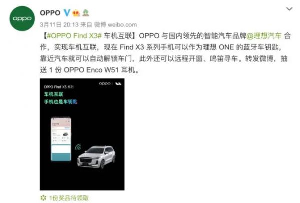 此前,OPPO在汽车领域也通过产业合作做了一些布局,3月份时,OPPO官方微博宣称,其“十年理想之作”Find X3系列手机与理想汽车达成合作,实现了车机互联。Find X3系列手机可以作为理想ONE的蓝牙车钥匙,靠近汽车就可以实现自动解锁车门,此外还可以实现远程开窗、鸣笛寻车。