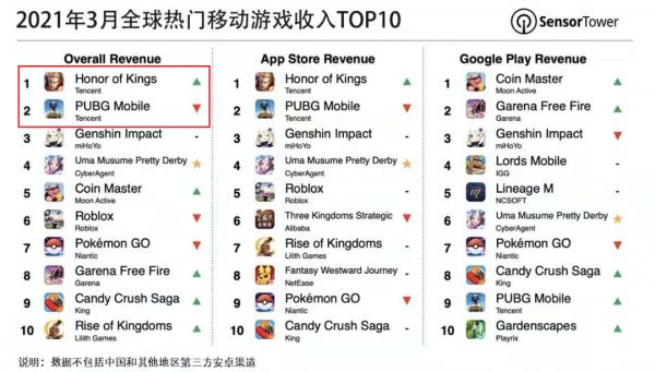 在全球市场,《王者荣耀》(国际版:Honor of Kings)也长期占据热门移动游戏收入榜榜首。SensorTower数据显示,2021年1月-3月,《王者荣耀》在全球APP Store以及Google Play市场分别吸金2.67亿美元、2.18亿美元、2.57亿美元,同比增长22%、57.2%、63%。