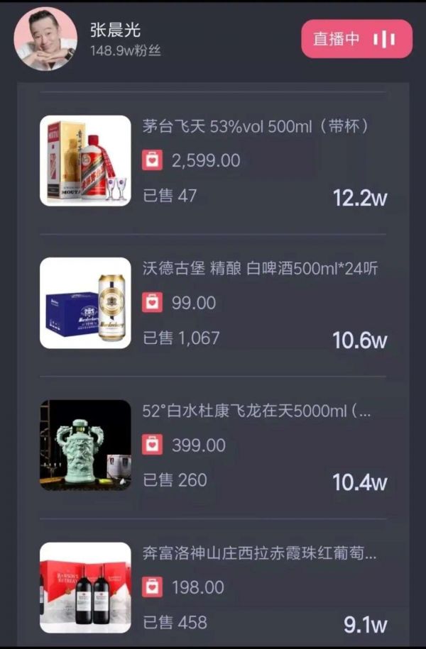 张晨光直播带货的酒品,售价最高的一款“茅台”为2599元