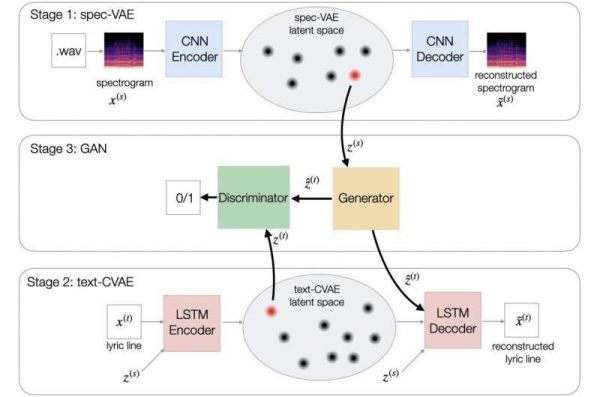 模型的架构由两个变分自动编码器(VAE)组成,一个用于学习音乐音频的表示,另一个用于学习生成歌词。