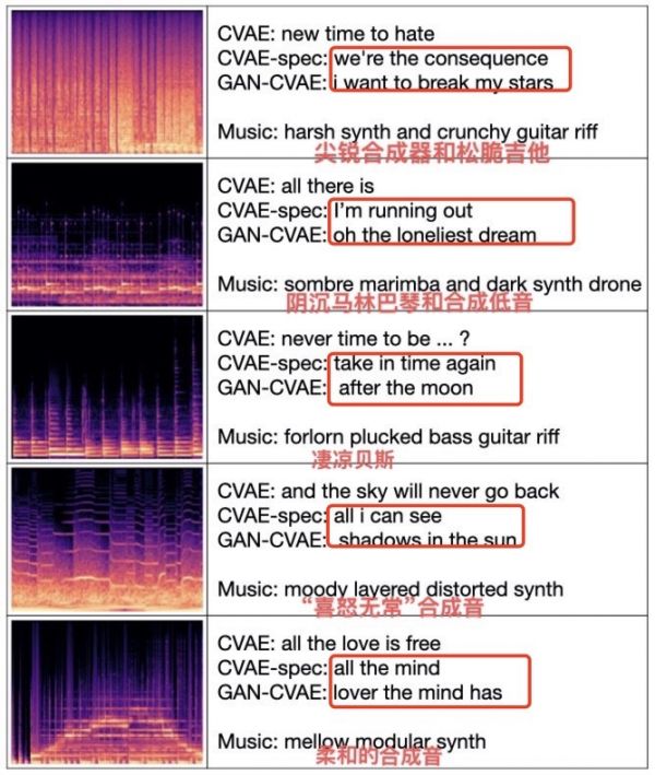 研究人员选用了5种不同乐器演奏的不同歌曲的片段,每段约10秒,用该模型的两种变体(下图中每组的第二三行)各生成一行歌词,再用一个基线模型(下图中每组第一行)生成歌词。