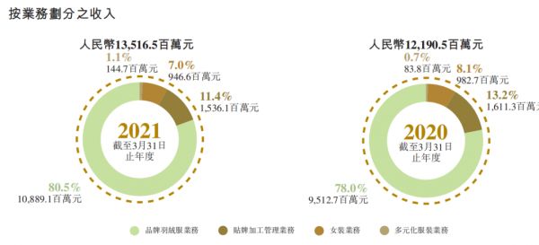 细分来看,波司登品牌羽绒服业务录得收入约108.89亿元,占总收入的80.5%;贴牌加工管理业务录得收入15.36亿元,占总收入的11.4%;女装业务录得收入约9.47亿元,占总收入的7.0%;多元化服装业务录得收入约1.45亿元,占总收入的1.1%。