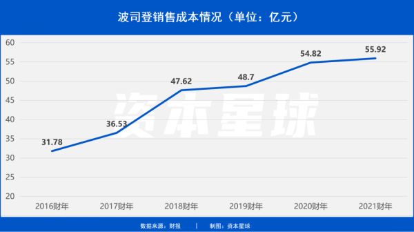 一系列操作下来,波司登的销售成本大幅提高,2020/21财年总共花掉55.92亿元,占营业收入的41.37%,这已经是公司销售成本连续六年上涨。