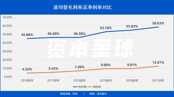 一系列降本增效的措施施行后,波司登的毛利率和净利率进一步增长,2020/21财年波司登毛利率和净利率分别为58.63%和12.61%,较前一财年均提高约3个百分点。
