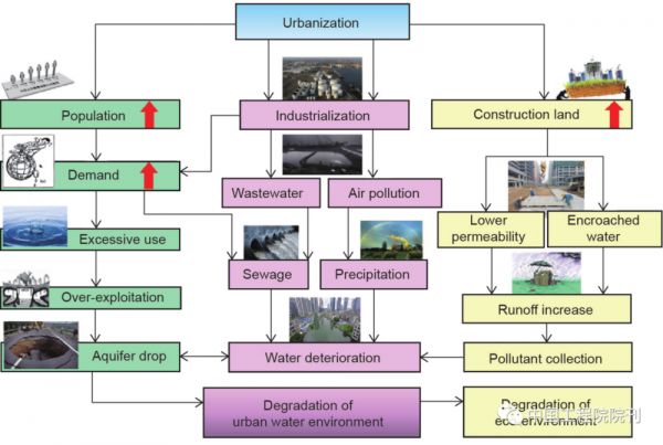城市化规模的不断扩大导致城市水的安全受到威胁,出现水质恶化、水量减少以及水生态退化,阻碍了城市化的可持续发展(图1)。因此,应该同时协调水环境、社会和经济之间的关系,以促进可持续和健康的城市化。