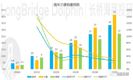 蔚来和小鹏2025年保有量突破100万辆(目前特斯拉的保有量超100万辆,特斯拉的领先优势再次得到证明)。