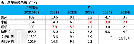 此外,造车三傻当前的市值水平对应未来五年的预测PS倍数见下表,海豚君认为,