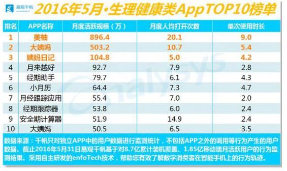 美柚在上线两年已经独霸榜单,易观智库根据千帆数据发布的2015年5月生理健康类的APP排行榜中,美柚凭借896.4万月活、20.1次月度人均打开数和9小时的单次使用时长登顶,狂甩同类大姨妈和姨妈日记。
