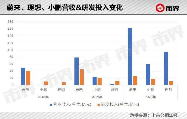 最新财报显示,2020年蔚来研发支出24.9亿元,理想研发投入为11亿元,小鹏研发费用则为17.26亿元。