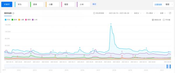 参照造车新势力和华为、小米的百度指数,可以看到声量上的显著差异。