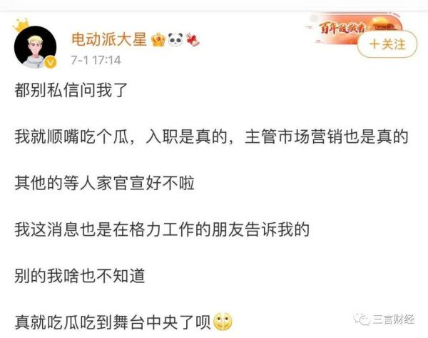 随后,@电动派大星再次发文,称自己就顺嘴吃个瓜,入职是真的,主管市场营销也是真的,其他的等官宣,消息来自格力内部人士。