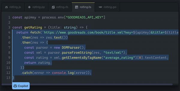 ▲GitHub Copilot自动补全抓取书评网站Goodreads评分的代码