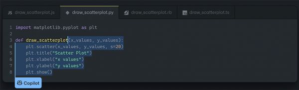 ▲GitHub Copilot自动补全绘制散点图代码