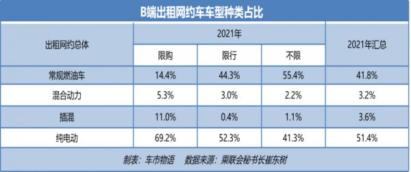 当然,现阶段出租网约车市场上燃油车的占比仍然很高,尤其是在非限行限购区域。据乘联会秘书长崔东树提供的数据显示,在巡游出租车和网约车市场上,2021年传统燃油车总占比为41.8%,在非限行限购城市占比达55.4%,限行城市中燃油车占比也达到了44.3%。