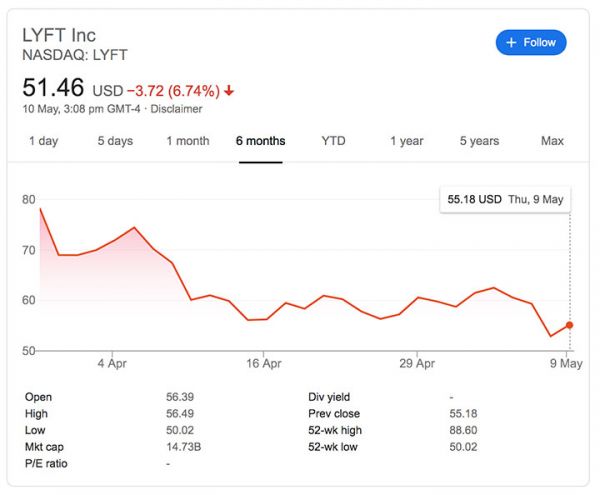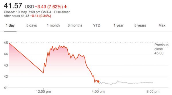 即使发行价已定在招股区间底部,Uber依然没逃过破发,开盘报42美元,较发行价下跌约6.667%,收盘于41.57美元,较发行价暴跌7.62%,市值缩水至不到700亿美元,遭遇「开门黑」。