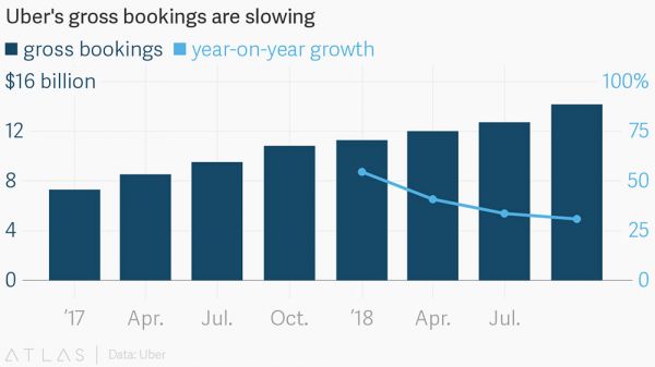 2018年第四季度Uber录得收入30亿美元,环比增长仅2%,比上一年度同期增长25%,但第三季度其收入同比增长还有38%,第二季度更是高达63%,增速放缓非常明显。