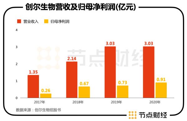 2017-2020年,创尔生物实现营业收入分别为1.35亿元、2.14亿元、3.03亿元和3.03亿元;实现归母净利润分别为0.26亿元、0.67亿元、0.73亿和0.91亿元。