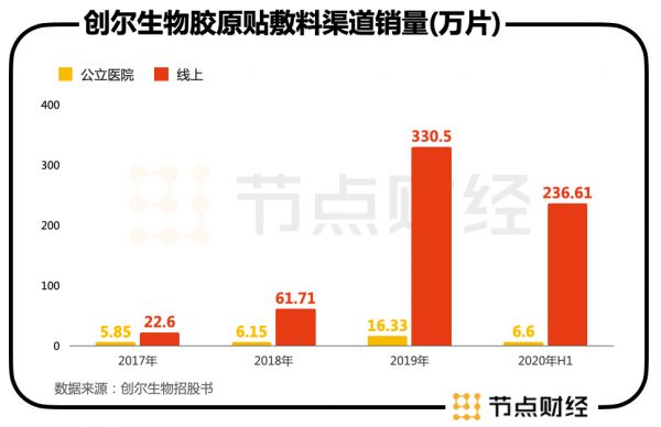创尔生物的生物护肤品销售模式主要分为经销模式、直销模式和产品终端销售三种。其中,最主要的模式为直销。在直销方面,创尔生物线下直销模式下销售的胶原贴敷料,主要销往公立医院及药房。2017-2020年H1,销往公立医院的数量分别为5.85万片、6.15万片、16.33万片及 6.60万片;线上方面,2017-2020年H1,创尔生物的胶原贴敷料销量分别为22.6万片、61.71万片、330.5万片、236.61万片。