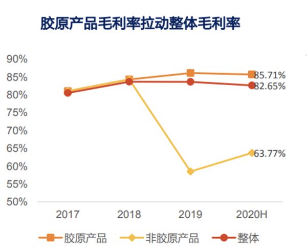 高速的增长的主要贡献动力来自于胶原产品。招股书显示,2020年,胶原产品占总营收的85.70%。不过,这种高占比正在逐年下滑,在2017年时,胶原产品占比高达95.02%。