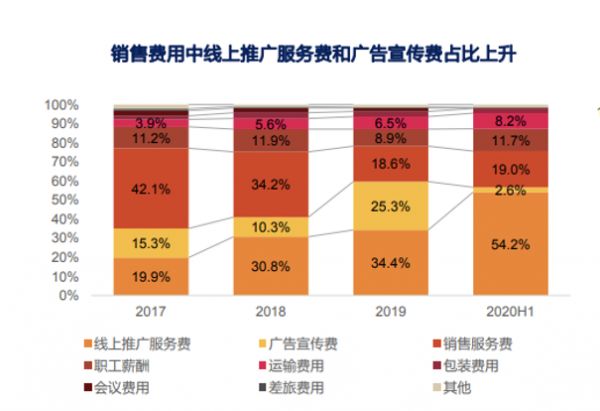 根据销售费用占比看,线上推广服务费和广告宣传费占比逐年上升,到了2020年H1,更高达54.2%。其中有一部分流入了顶流主播的口袋。