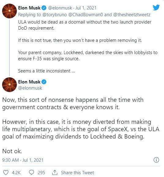 马斯克在推特上写道:“如果不是美国国防部要求有两家发射服务提供商,ULA早就废掉了。”他在随后的推文中补充道:“如果发生那种情况,SpaceX可以获得更多资金,推进其帮助人类成为多行星物种的目标,而不是ULA为洛克希德马丁和波音公司带来更多红利。”