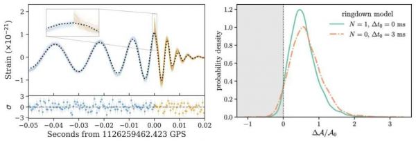 然后他们用之前的技术提取了这个新形成的黑洞衰荡(ringdown),即新形成黑洞的反射,由此计算了黑洞的质量和自旋,并最终计算出合并后黑洞视界总面积相当于 36.7 万平方公里。