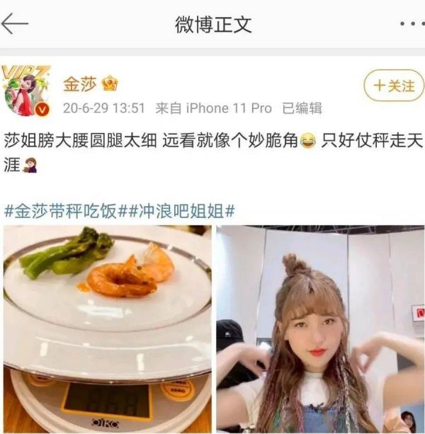 但另一方面,一种“数据控制身体”的焦虑同样愈演愈烈。金莎曾经发微博说自己为了减肥而带秤吃饭。“金莎带秤吃饭”这一话题随后登上热搜,引发网友们的对演员群体“体重焦虑”的感叹。
