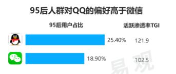 而渐渐踏入职场的95后,虽然被迫使用微信,但也对QQ有着深深的眷恋,易观曾有数据显示,QQ用户中95后占比高于25%,活跃渗透率TGI(某一群体相比全部群体对某个APP的感兴趣程度,大于100则代表高于全部人群,数值越高代表该人群感兴趣程度越高)高于微信。