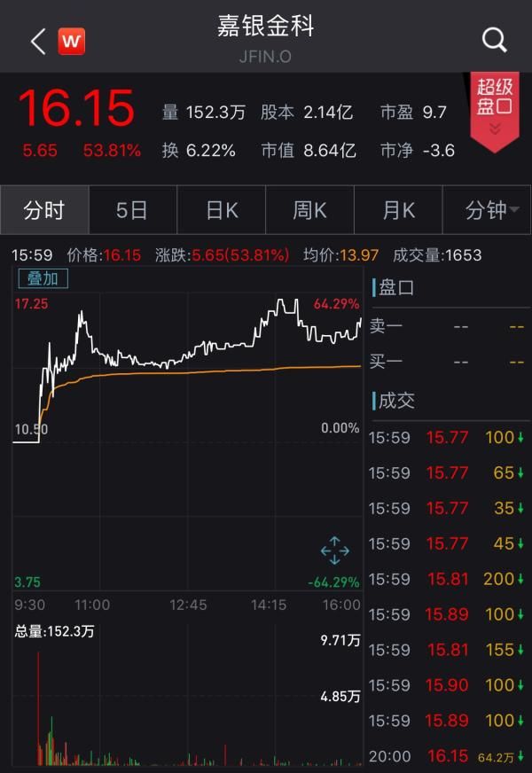 结合近半年来的监管风向与同行业已上市公司的数据,嘉银金科在首个交易日内的涨幅超过预期,开盘价报11美元,最高价17.25美元,报收于16.15美元,总体上涨53.81%。以收盘价16.15美元计算,嘉银金科上市后总市值约8.5亿美元。此前,互联网金融板块中概股在首个交易日内涨幅最大的是小赢科技的26%和趣店的21.58%。