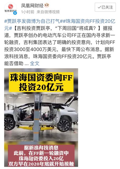 据新浪科技1月27日报道,在FF的最新一轮融资中,来自珠海市的国资将向FF投资20亿元。
