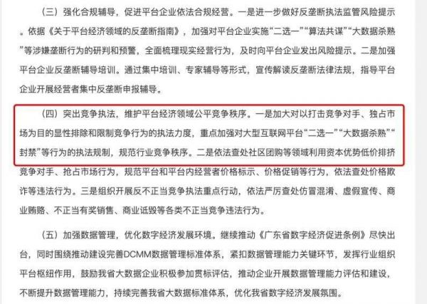 无独有偶,日前广东省市场监督管理局在答复广东省人大代表相关建议时,明确了下一步工作,将加大对以打击竞争对手、独占市场为目的显性排除和限制竞争行为的执法力度, 重点加强对大型互联网平台“二选一”“大数据杀熟”“封禁”等行为的执法规制,规范行业竞争秩序。