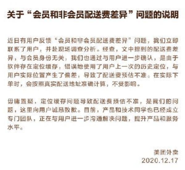 比如,针对网友“漂移神夫”的说法,美团给出的回应是,预估配送费差异与会员身份无关,是定位缓存偏差导致。用户实际下单的配送费,会按照真实配送地址准确计算,不受影响。