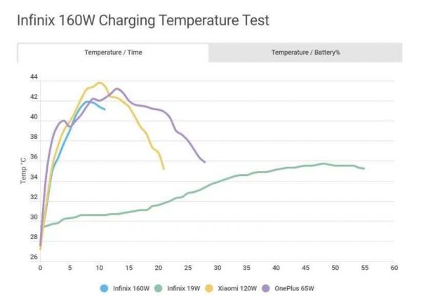 而且快充过程中,传音Infinix Concept Phone 2021的电池充电温度能够保持在42度以下,这个数据比小米120W和一加65W的充电温度都要低一些。