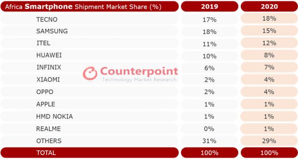 上述所有因素结合在一起,让传音成为了非洲手机市场的王者。市场调研机构Counterpoint统计的数据显示,2020年传音旗下的TECNO以18%的市场份额,位列非洲手机市场第一。而传音另外两个手机品牌的市场份额分别为12%和7%,这样折算下来,传音三个品牌加起来占据了37%的非洲手机市场份额。