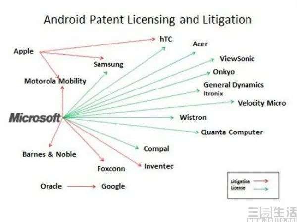 为了力推自家的Windows Phone系统,微软开始给谷歌的Android使绊子。在2010年,微软声称Android操作系统未经许可使用了其部分技术,并且起诉了彼时还是一家独立企业的摩托罗拉,同时也开始大量向HTC、三星等Android阵营的厂商征收专利费用,HTC每售出一台Android设备就需要支付微软5美元的专利费。
